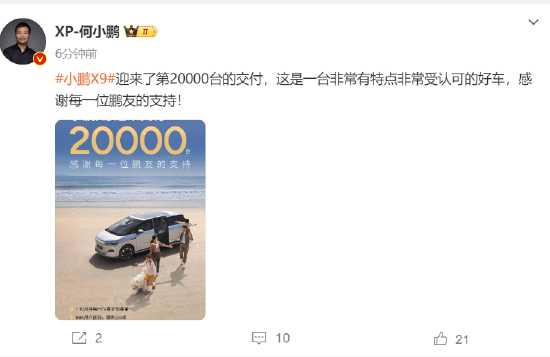 11月25日上昼音讯,小鹏汽车董事长何小鹏在微博示意,小鹏X9迎来了第20000台的录用。
